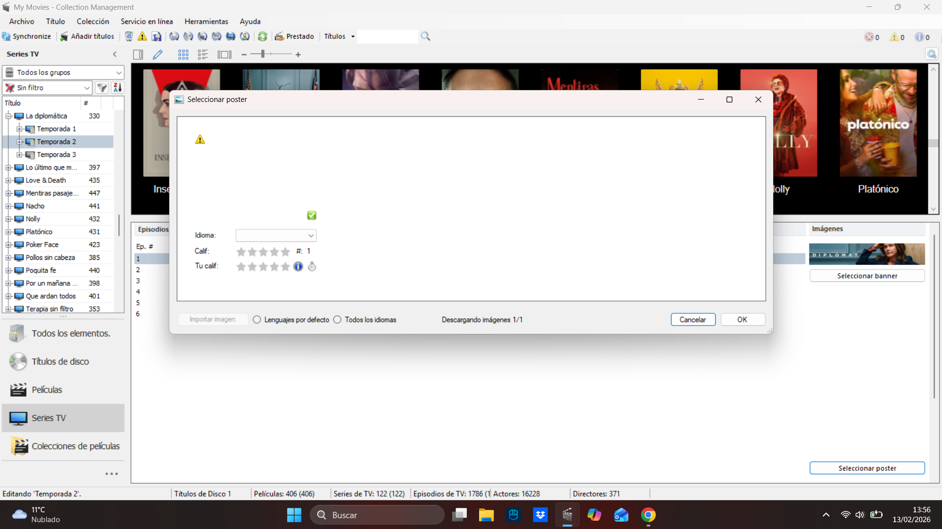 I'm using version 5.43 and I have the same problem, I can no longer change the posters for the series seasons. when I click on ‘select poster’, the window opens but nothing loads in the image download. I am unable to add a new one or select an existing one. File Attachment(s):