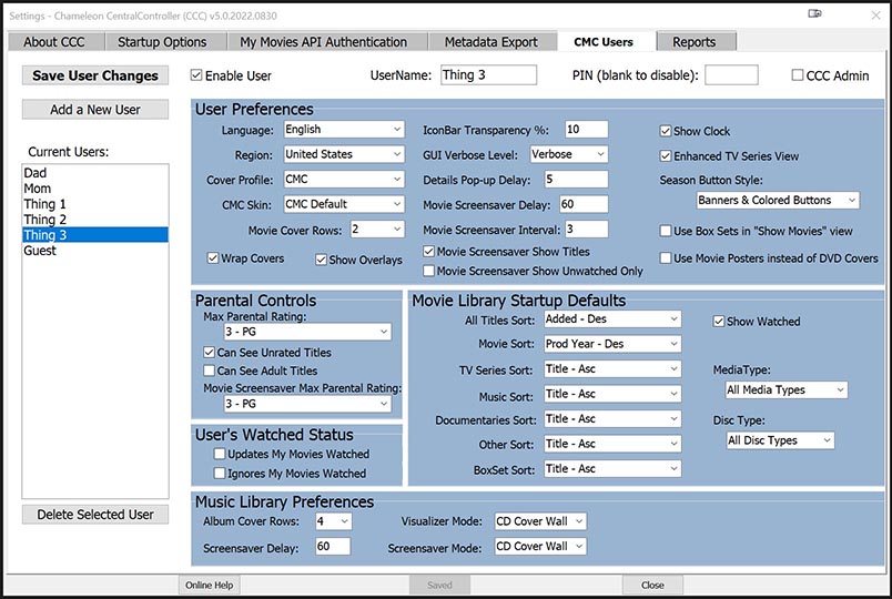 But CCC is more than just a data exporter/importer, as it also allows you to manage user accounts for each of your family members, friends and guests. Movies and TV Episode watched status is tracked individually per user, you can set individual parental restrictions, and even customize how CMC looks per user. CCC automatically syncs user account data to all of your CMC PC's.