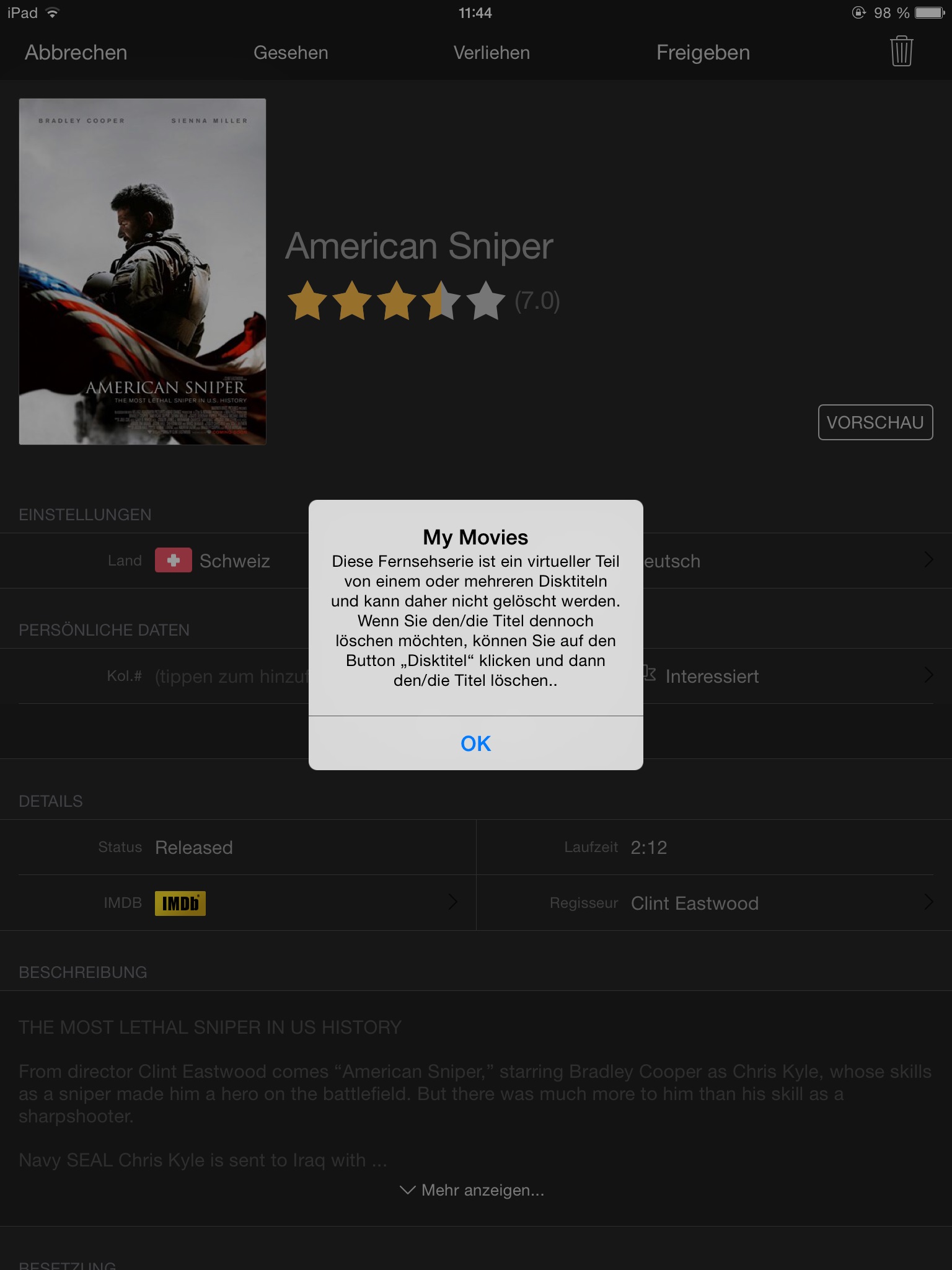 See the pictures: Step 1: American Sniper is available as disc. Step 2: I delete the disc. Step 3: Neither the disc of the generic movie can be found. Step 4: I try to add the generic movie, but the + is grayed. I can go into the details of the generic movie. When I try to delete it, I got a strange error message. . File Attachment(s):