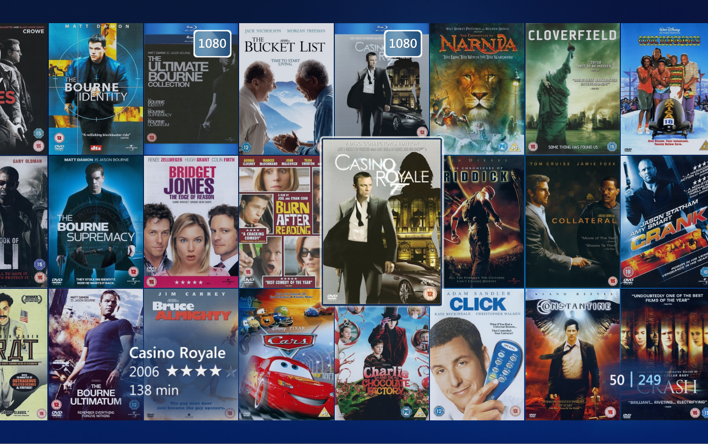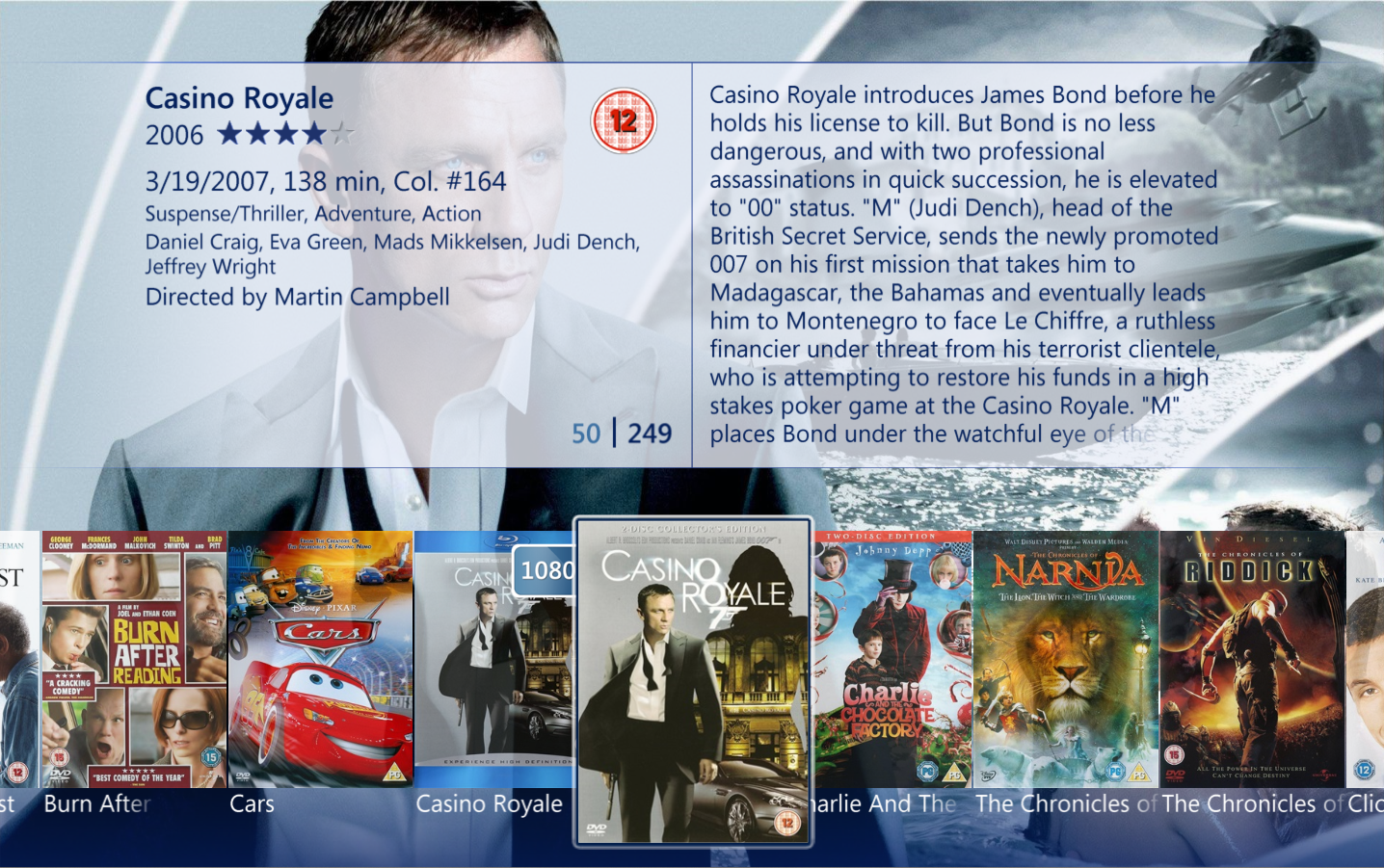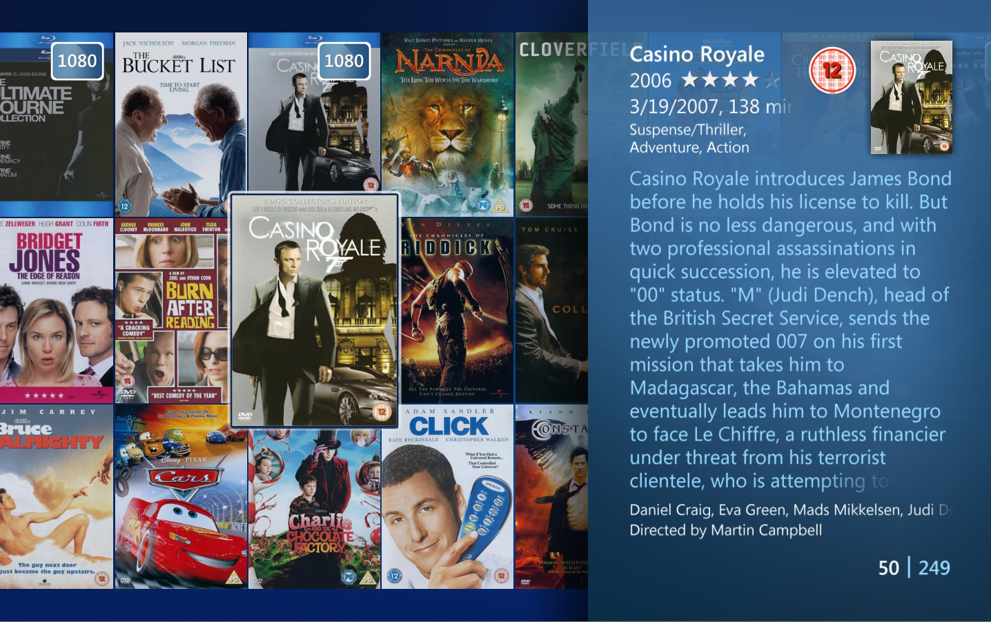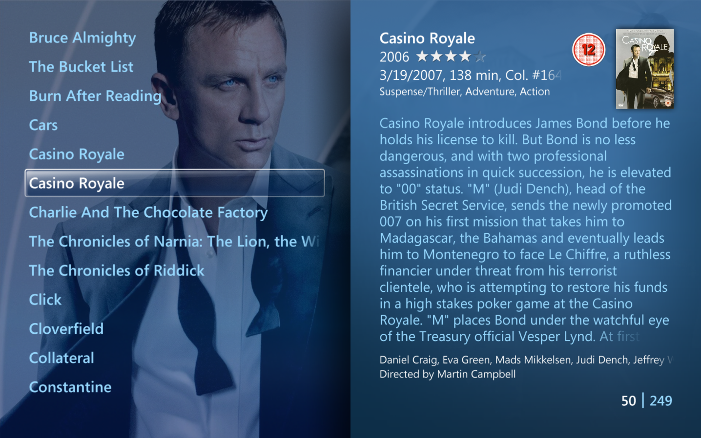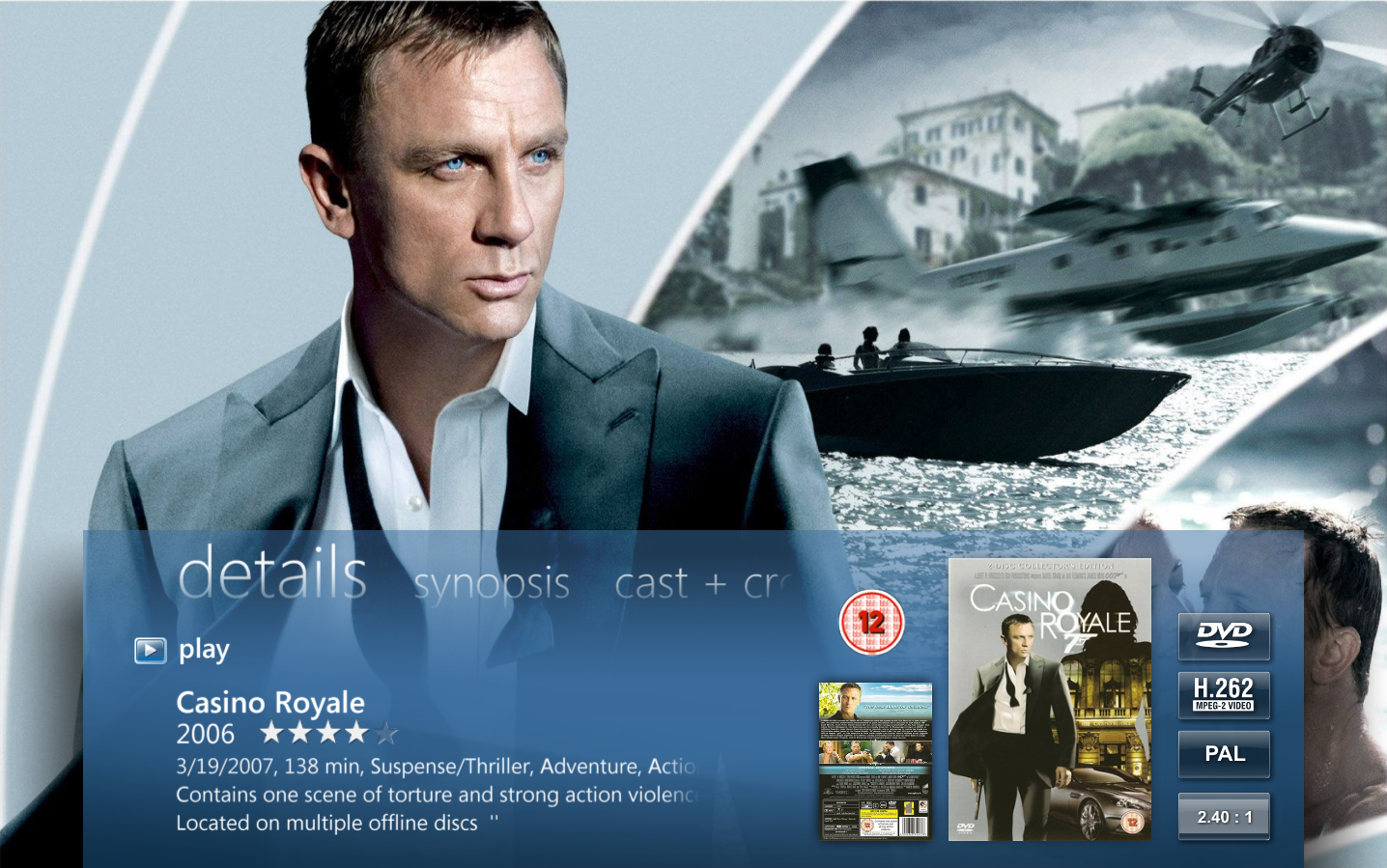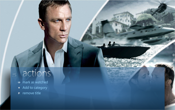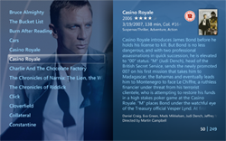 To view title details choose a title from the movie library and the detail view will open. Here you find information about the title, a trailer (if one is available), a synopsis, cast and crew, audio and subtitles, similar movies (requires 2500 points) and you have the option to change watched status, add to a category (created in Collection Management) as well as removing the title. From the main view of the title you can enlarge the front and back cover, and you can start playback of the title if it is stored on your PC or server, otherwise it will prompt you to insert the disc.