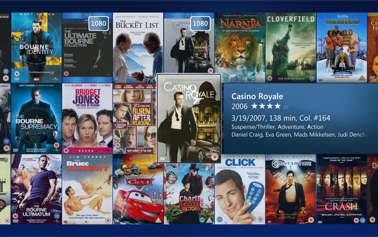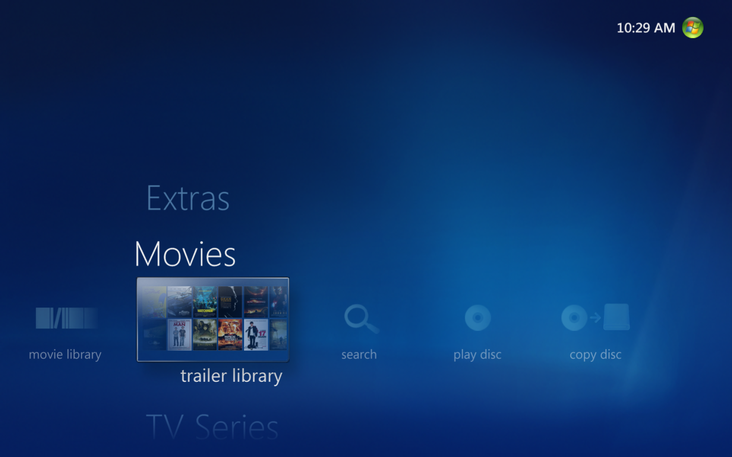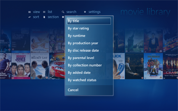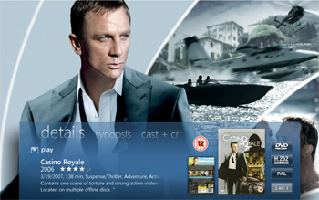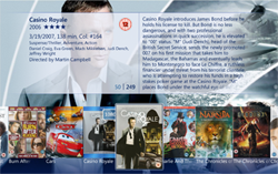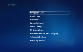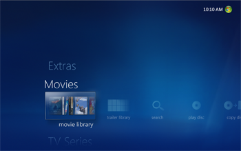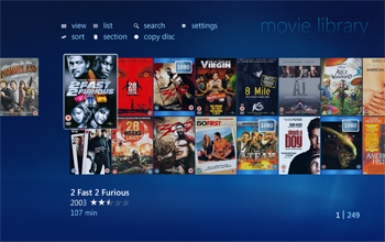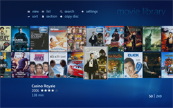 Once you are logged in to My Movies Collection Management and have added titles to your collection it will be visible in the Windows Media Center. Collection Management do not need to be open, you just need to be logged in. Windows Media Center has a built-in movie library which is placed between the music and the TV library, your My Movies Collection library is placed at the top of the start page just below the 'Extra' strip. You can hide the default Windows Media Center library from the Collection Management settings, so that you only have one movies library displayed in the Media Center. In the 'Movies' strip choose 'movie library' to browse your collection.