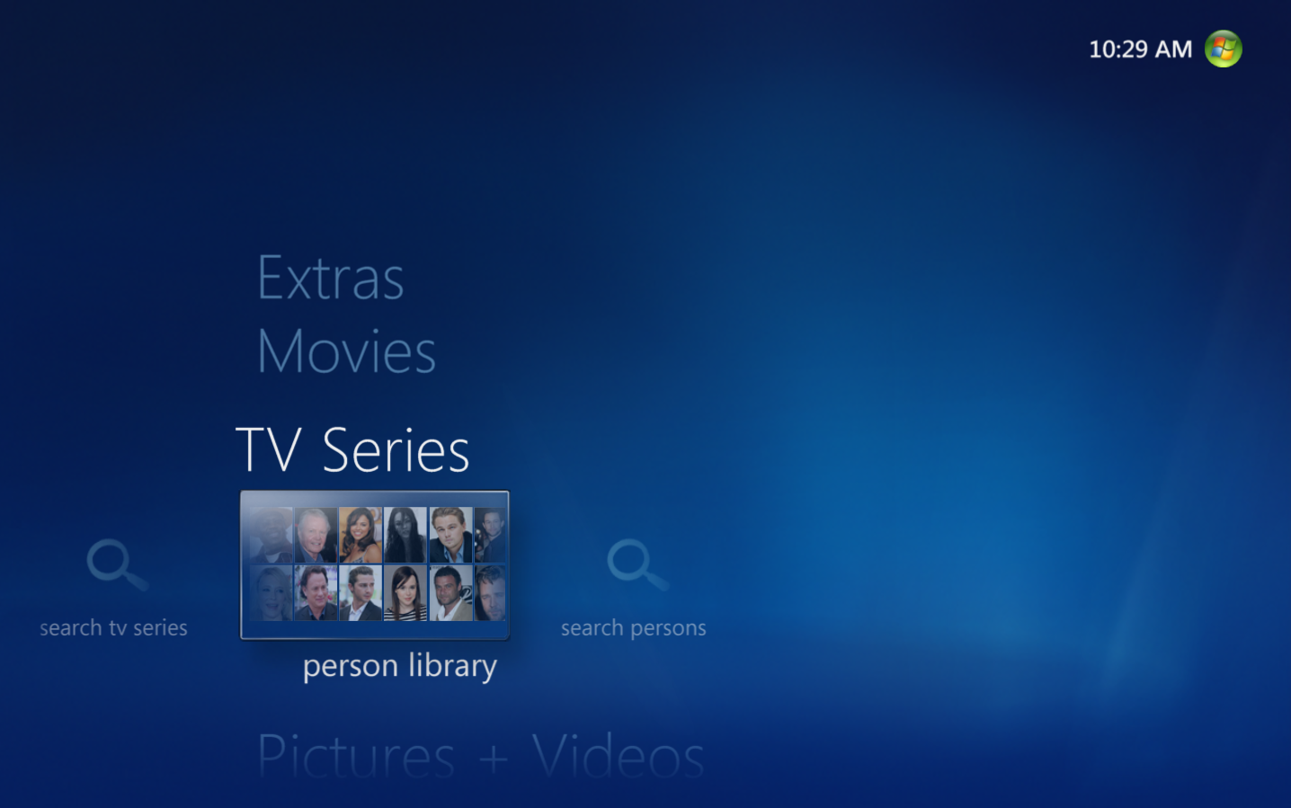 In the person view you can see profiles of actors and directors including picture, biography and which titles they star or direct in your collection. The person library is placed in the TV series strip on the start page. The listing can be changed to display all persons, all roles, popular, actors, directors, writers, producers, cinematographers, editors, music crew, sound crew and art crew.
