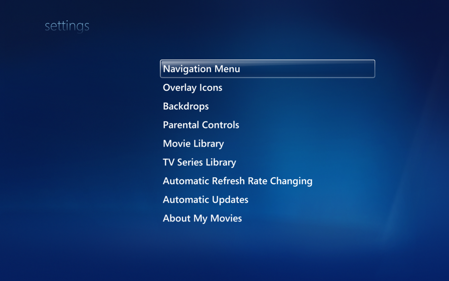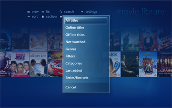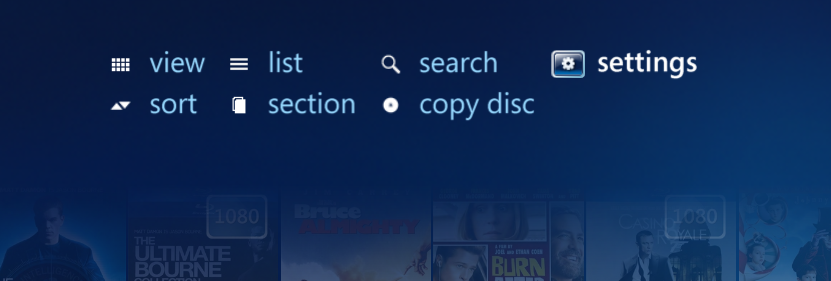 From the menu within the movie, TV series and person library you can access the settings menu. From here you can change various settings for the libraries as well as view, navigation and more.