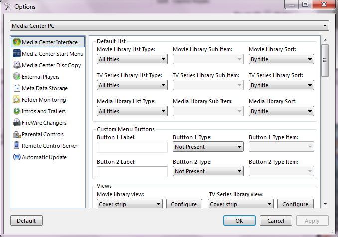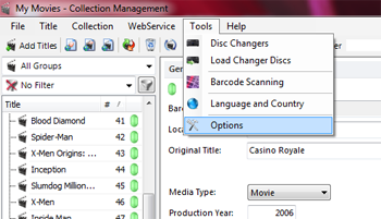 You can also change settings from the Collection Management. To do this open the 'Tools' menu and choose 'Options'. The first three topics concerns the Media Center.