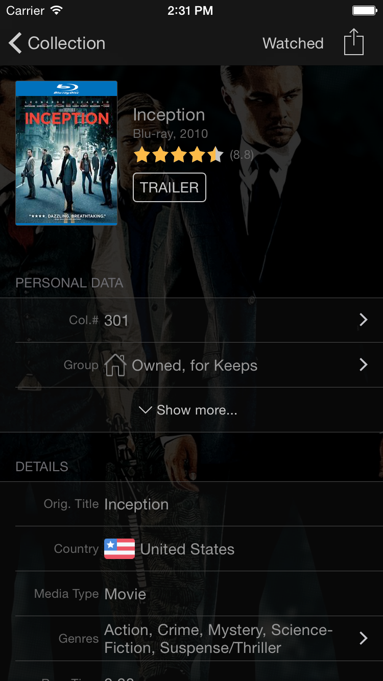 Use the camera barcode scanner to quickly add disc titles on DVD or Blu-ray to your collection, or view trailer and details of a DVD or Blu-ray by scanning the barcode using the camera. The barcode scanner contains a multi scan feature which allows you to add multiple titles at once, making it easy and quick to catalog your entire collection. You can just as easily add disc titles by typing the barcode or title, as well as add movies or tv series on digital copies through title searches from our large online collection of titles.