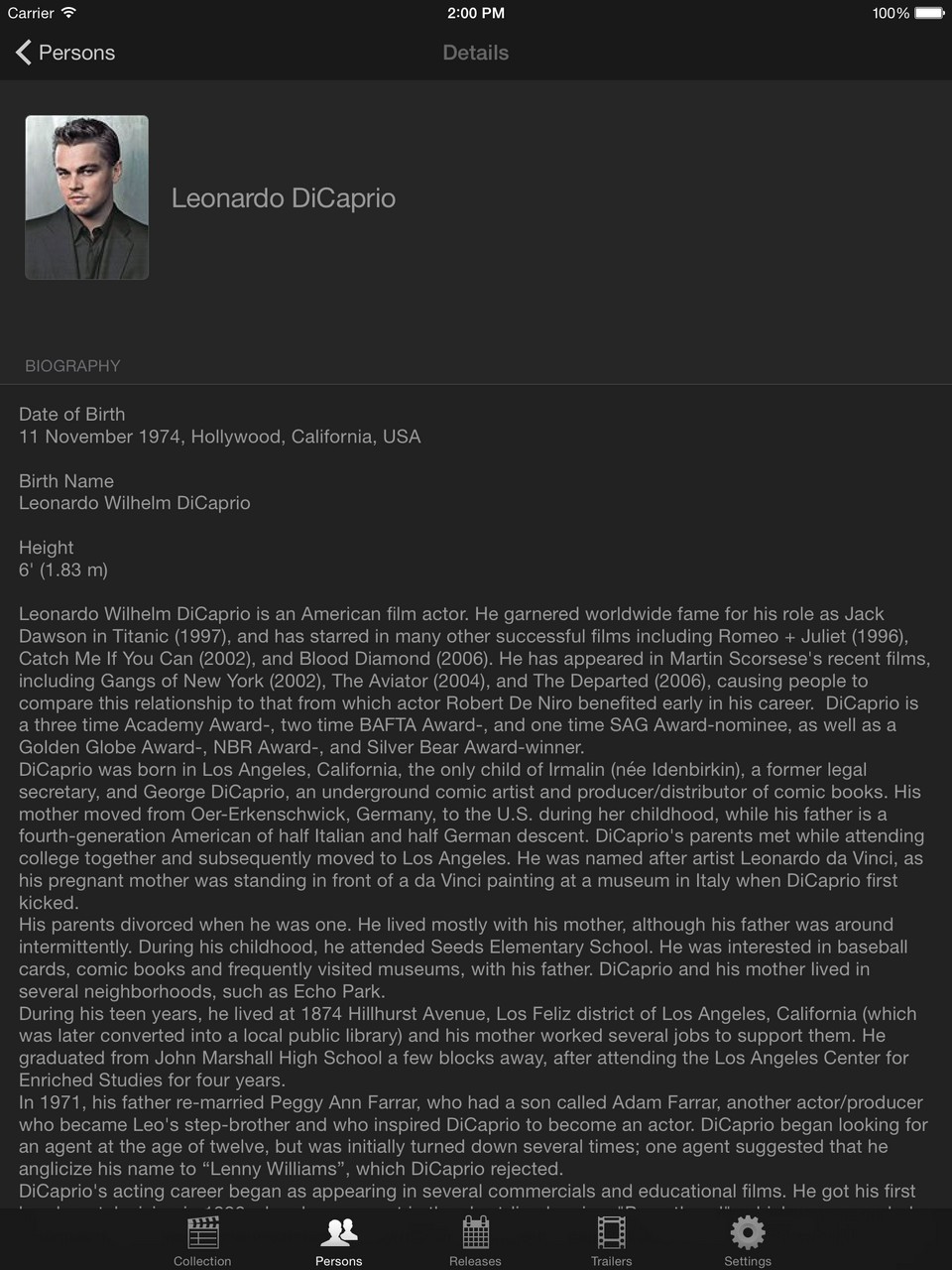 Want to see a movie with a specific actor or director, search your collection for persons, and view a picture and biography of these.